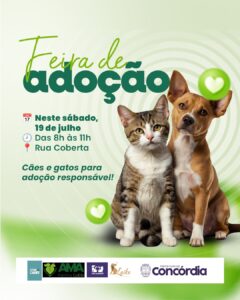 Neste sábado, 19 de julho, das 8h às 11h, a Rua Coberta de Concórdia será palco de mais uma Feira de Adoção de cães e gatos. A ação tem como objetivo incentivar a adoção responsável e dar um novo lar a animais resgatados ou abandonados.