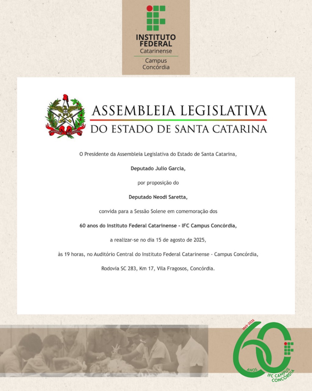 O deputado estadual Neodi Saretta promove, nesta sexta-feira, 15 de agosto, uma sessão solene da Assembleia Legislativa de Santa Catarina em homenagem aos 60 anos do Instituto Federal Catarinense, Campus Concórdia. O ato será realizado às 19h no auditório da instituição e reunirá autoridades, professores, estudantes, servidores, ex-alunos e representantes da comunidade.