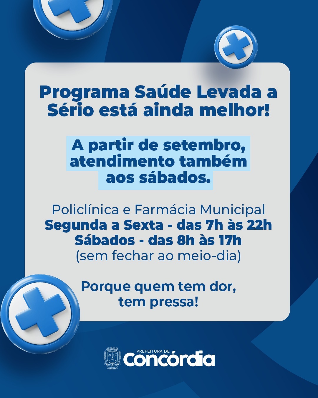 O Programa Saúde Levada a Sério, criado em abril deste ano, trouxe avanços importantes no atendimento básico em Concórdia. Desde então, a Policlínica e a Farmácia Municipal passaram a atender das 7h às 22h, de segunda a sexta-feira, garantindo consultas no mesmo dia e entrega de medicamentos após as 17h, o que evita longas esperas e melhora o acesso da população aos serviços de saúde.