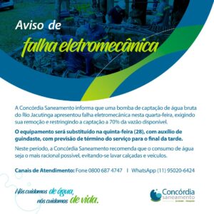 A Concórdia Saneamento informa que uma bomba de captação de água bruta do Rio Jacutinga apresentou falha eletromecânica nesta quarta-feira, exigindo sua remoção e restringindo a captação a 70% da vazão disponível.