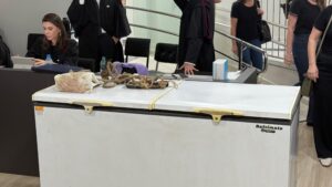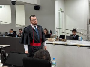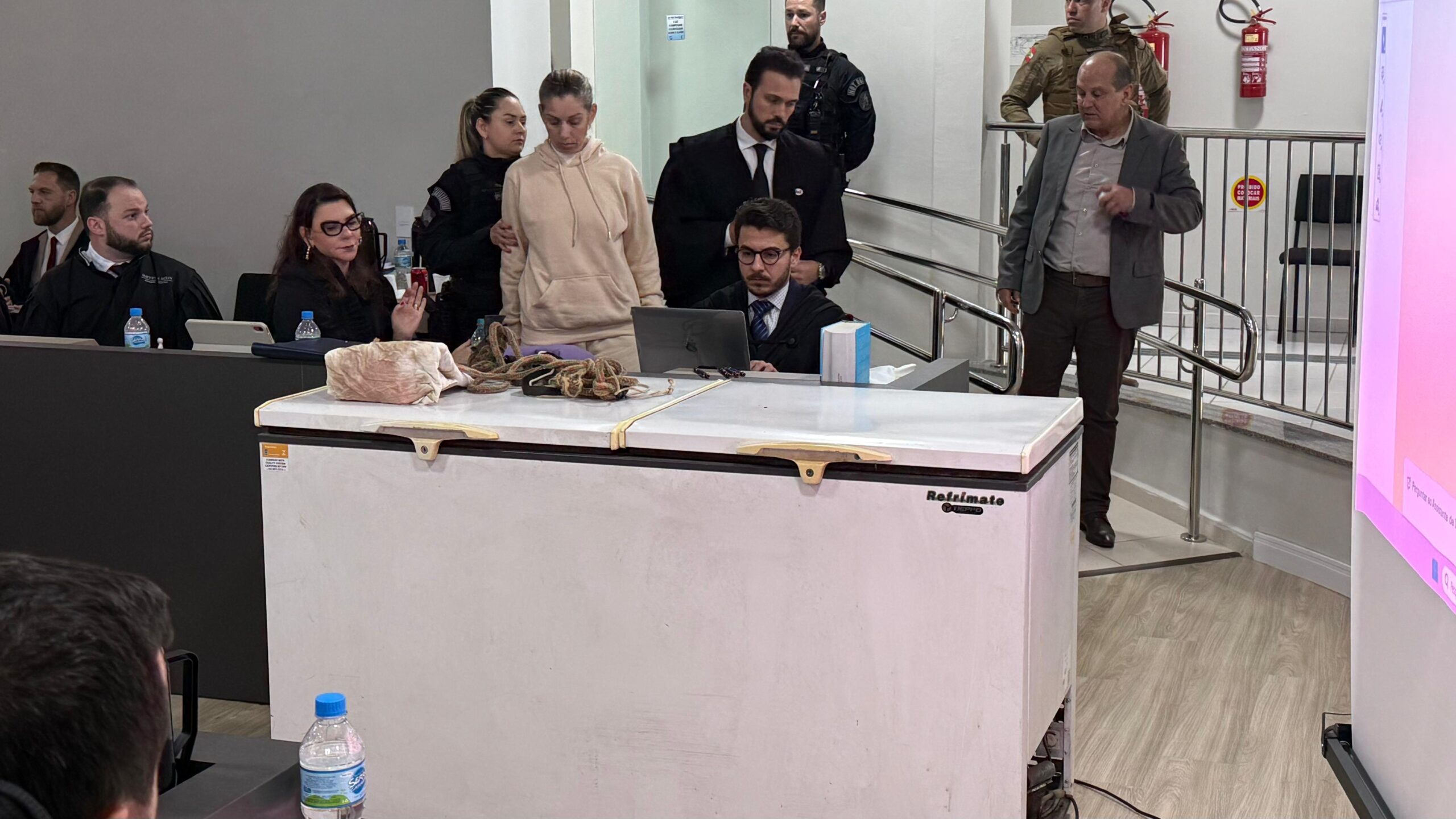 Dentro da sala do júri, os jurados têm diante de si os principais elementos do caso: o freezer onde o corpo foi escondido, além das cordas, uma câmara de pneu, um pano e uma sacola que teriam sido utilizados por Cláudia na execução e ocultação do crime. Esses objetos foram apresentados como provas materiais para sustentar a tese de homicídio qualificado, reforçando a gravidade do ato cometido.