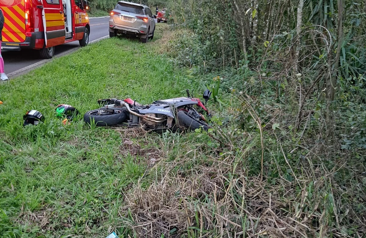 Um jovem de 24 anos ficou ferido na tarde deste sábado (30) após sofrer uma queda com a motocicleta que conduzia na SC-390, na comunidade de Linha Santana, em Ipira, Oeste catarinense. O acidente ocorreu por volta das 17h40 e mobilizou uma equipe do Corpo de Bombeiros Militar de Piratuba, que deslocou uma viatura até o local.