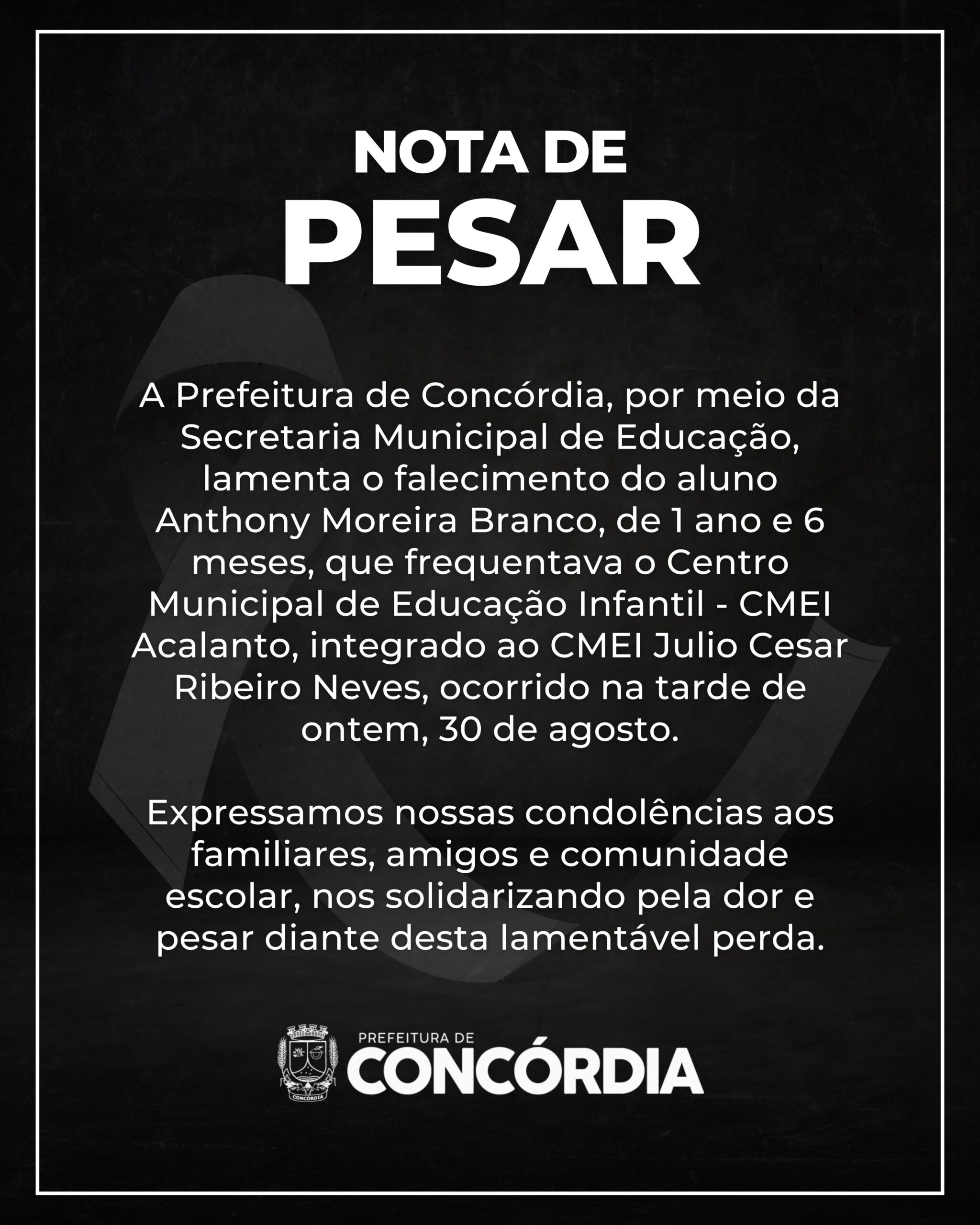 A família pede respeito à dor e privacidade neste momento difícil. O velório acontece na sala municipal de Concórdia. A missa ocorre nesta segunda-feira, 1º de setembro, seguida de sepultamento no Cemitério Municipal. A Prefeitura emitiu nota de pesar e informou que o menino era aluno do CMEI Acalanto, vinculado ao CMEI Júlio César Ribeiro Neves. A gestão municipal manifestou solidariedade à família, aos amigos e à comunidade escolar.