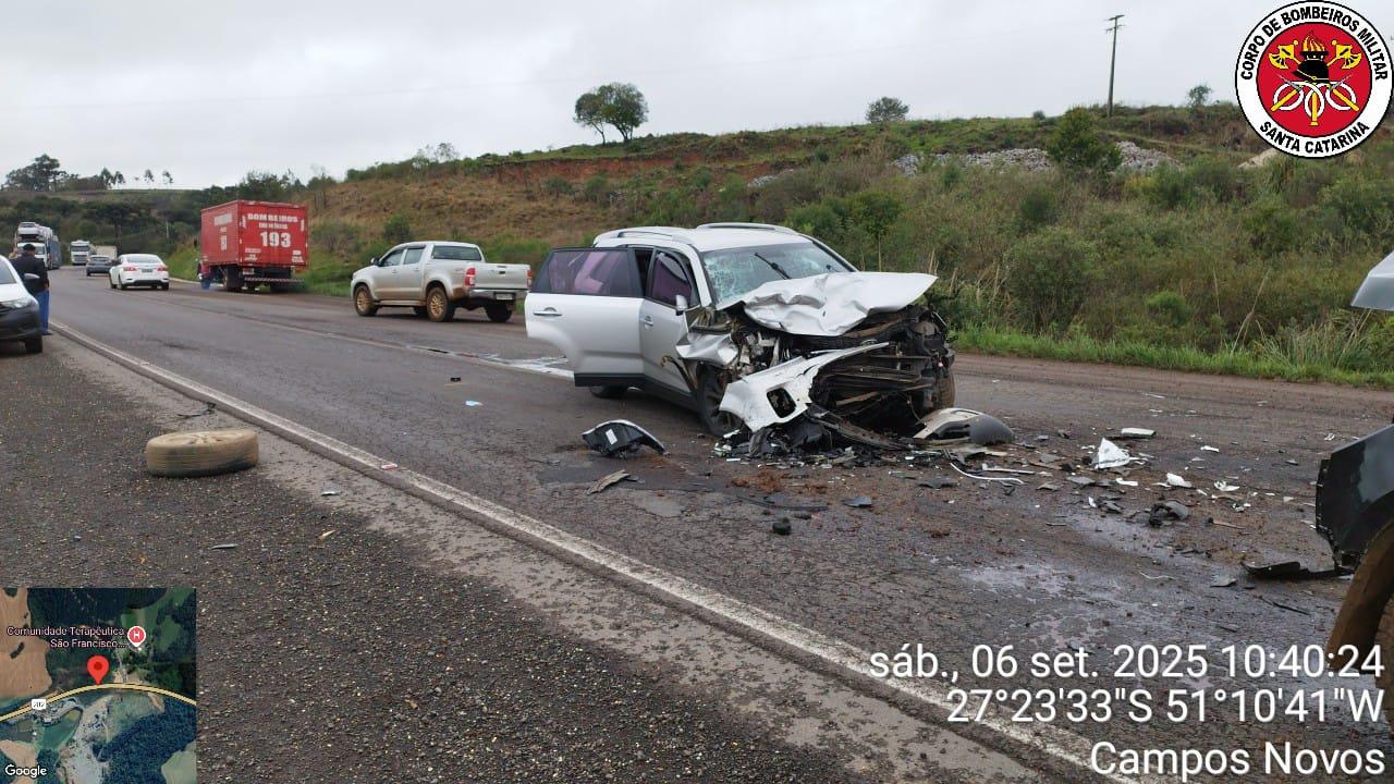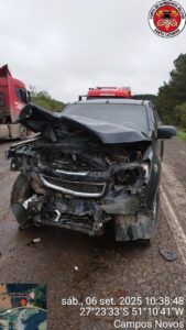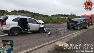 Na manhã deste sábado (6), por volta das 10h30, uma colisão frontal entre dois veículos mobilizou o Corpo de Bombeiros Militar em Campos Novos. O acidente ocorreu na BR-282, em frente ao britador Britasul, envolvendo uma caminhonete S10 preta e uma KIA Sorento prata. O motorista da S10, de 60 anos, não se feriu e permaneceu no local. Já na Sorento estavam quatro ocupantes: o condutor, de 21 anos, que saiu ileso, e três passageiros que precisaram de atendimento médico.