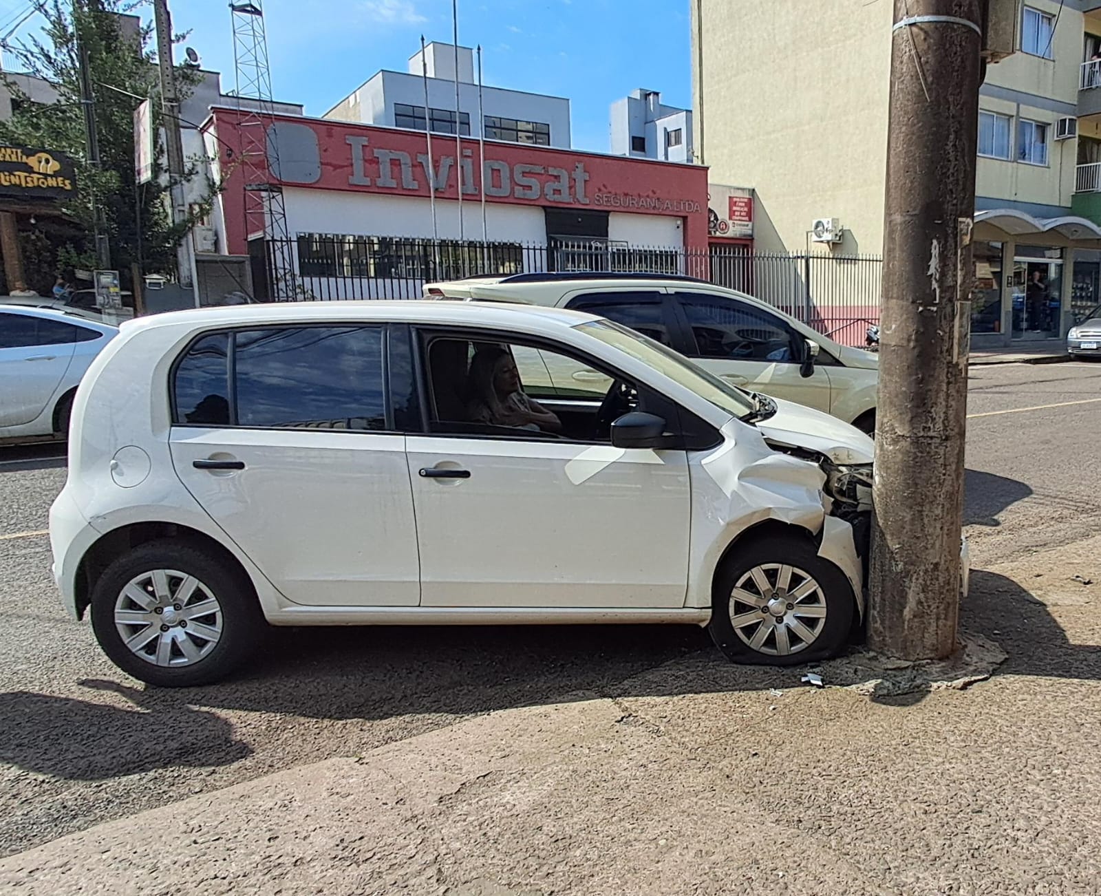 Uma colisão foi registrada no inicio da tarde dessa quinta-feira na rua Marechal Deodoro em frente ao Ser Sadia. Um veículo Volkswagen Up colidiu com um poste, ainda não há informações sobre feridos.