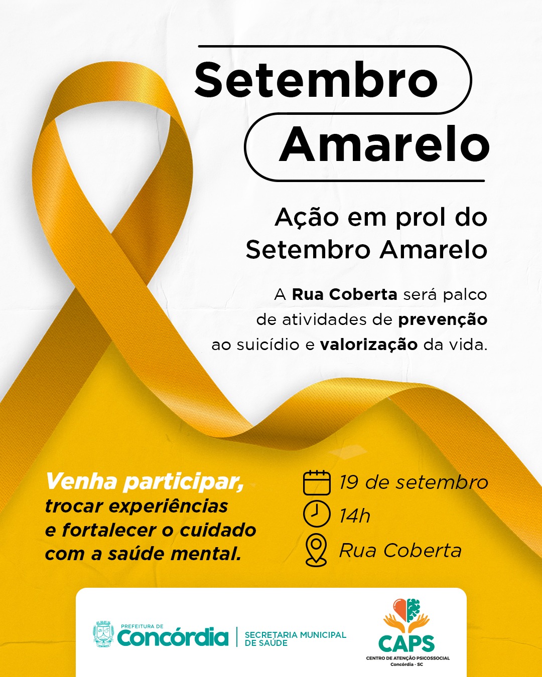 Nesta sexta-feira, dia 19, tem mobilização na Rua Coberta alusiva ao Setembro Amarelo. Diversas atividades programas pela Secretaria de Saúde, por meio do CAPS, a partir das 14h. Por conta da programação, a Rua Coberta será fechada para o trânsito de veículos, na noite desta quinta-feira, 18.