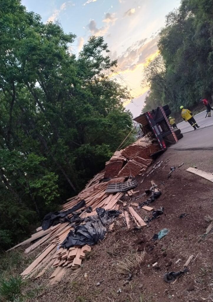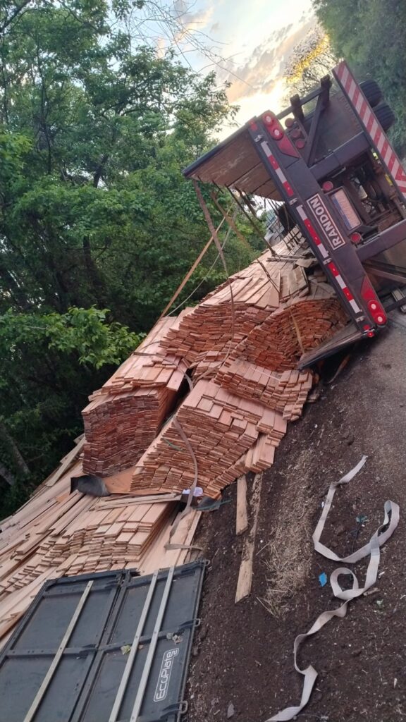 O tombamento de uma carreta na BR-282, entre Xaxim e Cordilheira Alta, provocou filas quilométricas na noite deste sábado (20 de setembro). O acidente ocorreu por volta das 18h50, quando o veículo, carregado com madeira, saiu da pista próximo a uma curva e radar. O motorista foi encontrado consciente, com apenas escoriações no braço, e levado ao Hospital Frei Bruno, em Xaxim.