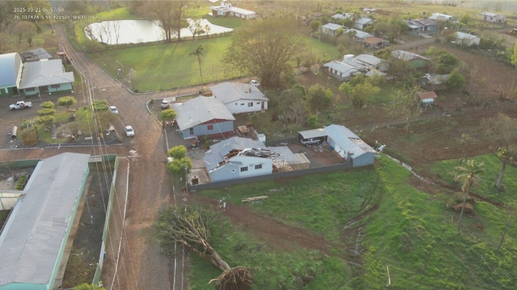 A Defesa Civil de Santa Catarina confirmou que um tornado atingiu a localidade de Barra Bonita, no Extremo Oeste do estado, na noite de sábado (20), durante intensos temporais causados por uma combinação de calor elevado e instabilidade atmosférica. O fenômeno deixou um rastro de destruição: telhados parcialmente destruídos, queda de árvores tombadas, granizo e danos em edificações foram registrados em São Miguel do Oeste e Barra Bonita. Apesar dos prejuízos materiais visíveis, não houve registro de feridos.