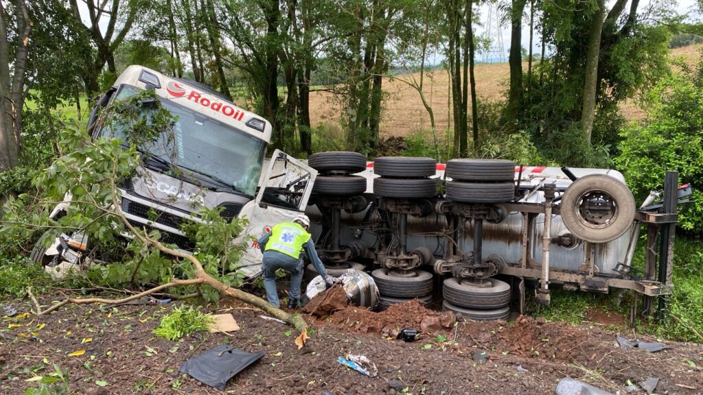 Um grave acidente entre duas carretas foi registrado na manhã desta sexta-feira (3), na SC-157, em Coronel Freitas, culminando com um motorista preso às ferragens. O fato ocorreu por volta das 9h20, em uma curva, e envolveu dois veículos de carga — um deles carregando combustível, que tombou fora da pista em área de mata.