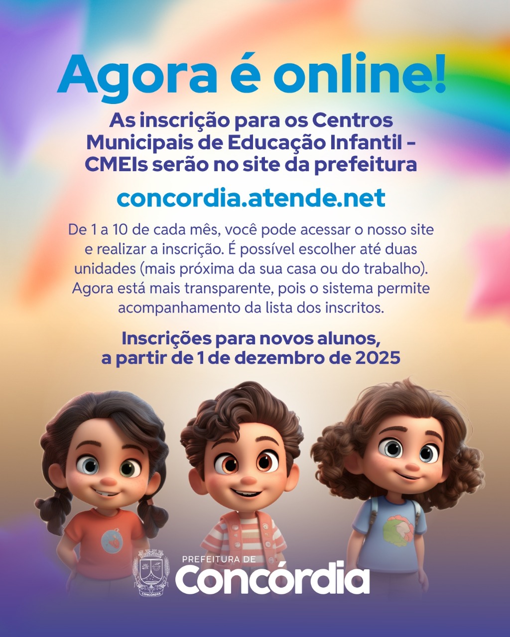 A Secretaria de Educação informatizou o processo de novas inscrições para os Centros Municipais de Educação Infantil – CMEIs. Agora, a solicitação deve ser feita de forma online, nos primeiros dez dias de cada mês, iniciando a partir de 1 de dezembro. Os pais e/ou responsáveis, podem indicar até duas unidades – próxima à residência e outra próxima ao trabalho – que são os critérios de distribuição de vaga.