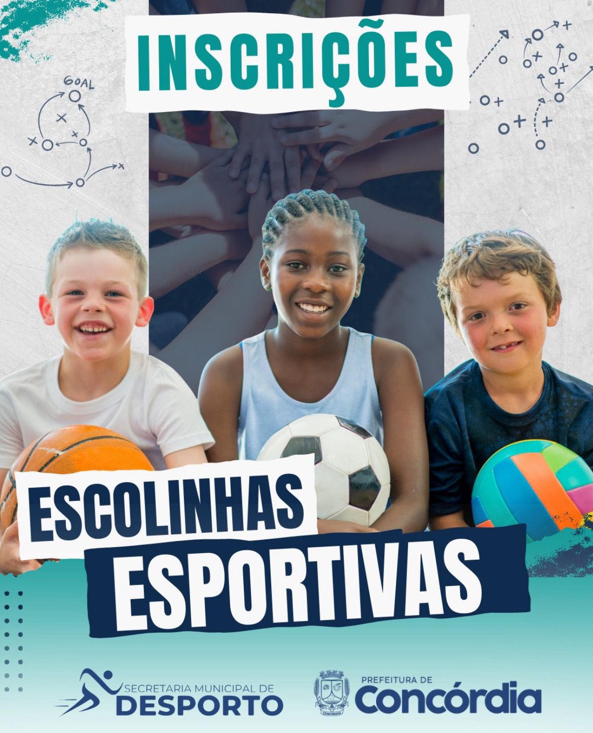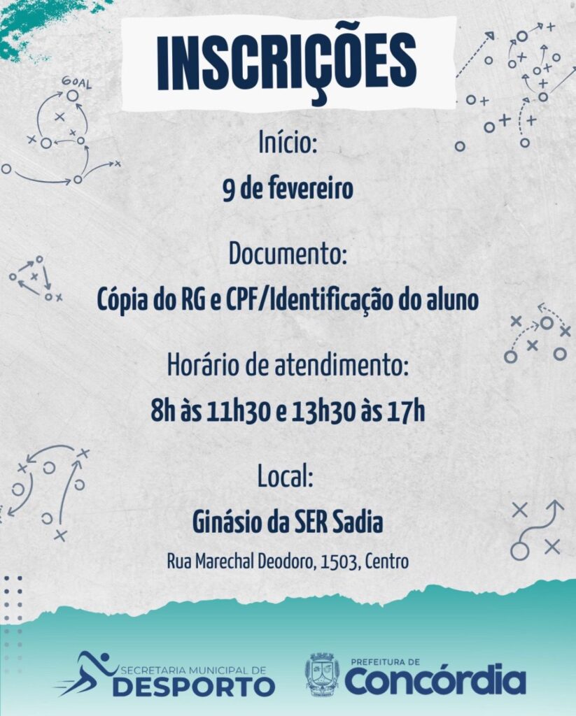 A Secretaria Municipal de Desporto informa que na próxima segunda-feira, 9 de fevereiro, iniciam as inscrições para as Escolinhas Esportivas 2026. Os interessados devem comparecer no ginásio da Ser Sadia, situado na rua Rua Marechal Deodoro, nº 1503, Centro. O horário de atendimento é das 8h às 11h30 e das 13h30 às 17h.