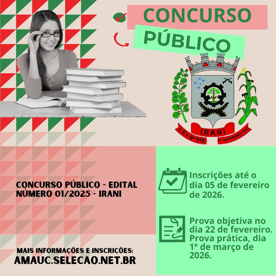 A Prefeitura de Irani abriu nesta quarta-feira (7) o período de inscrições para o Concurso Público que visa o preenchimento de 20 vagas, além da formação de cadastro reserva para diferentes cargos da Administração Pública Municipal.