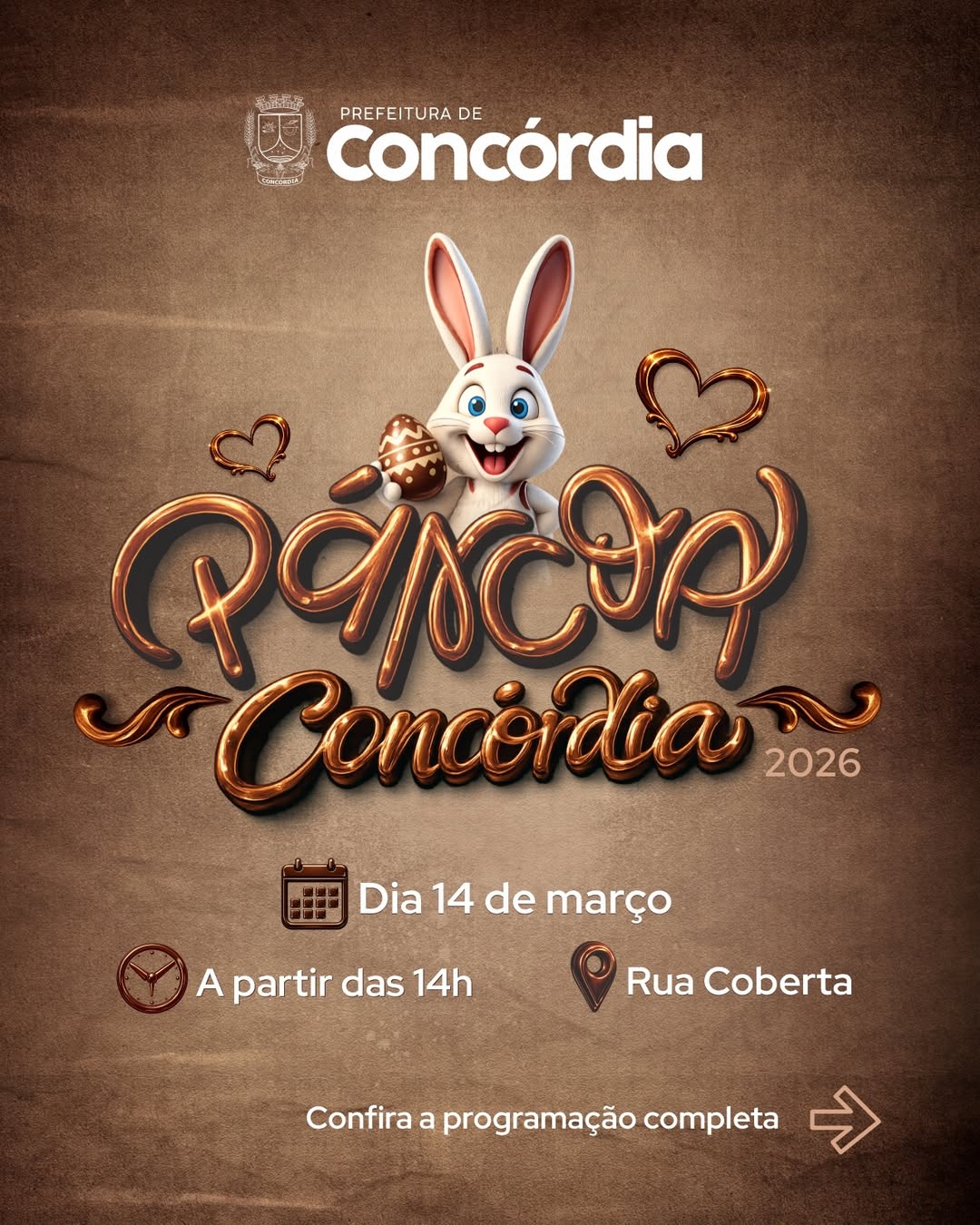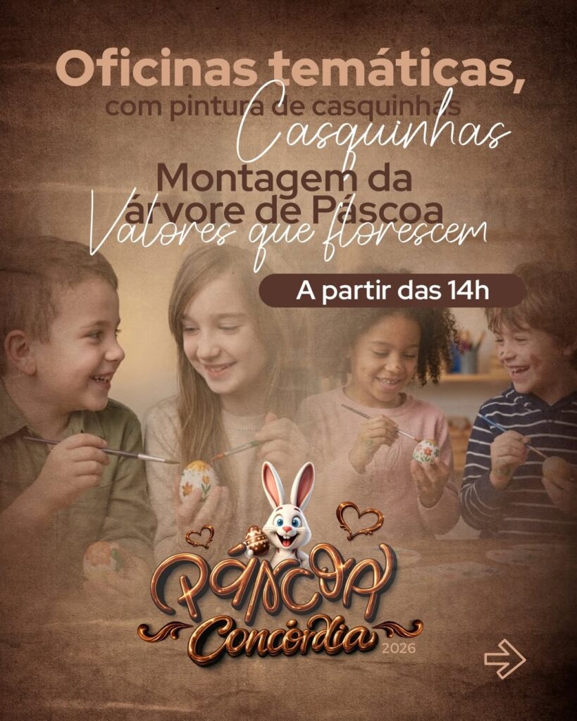 A Prefeitura de Concórdia irá realizar uma programação especial de Páscoa na área central do município neste sábado, dia 14, com atividades iniciando a partir das 14h. O evento gratuito busca reunir as famílias em torno de tradições como a pintura de casquinhas e a montagem da árvore de Páscoa, dentro do projeto “Valores que Florescem”. A iniciativa transforma o centro da cidade em um espaço de convivência e celebração, fortalecendo o espírito comunitário nesta época do ano.