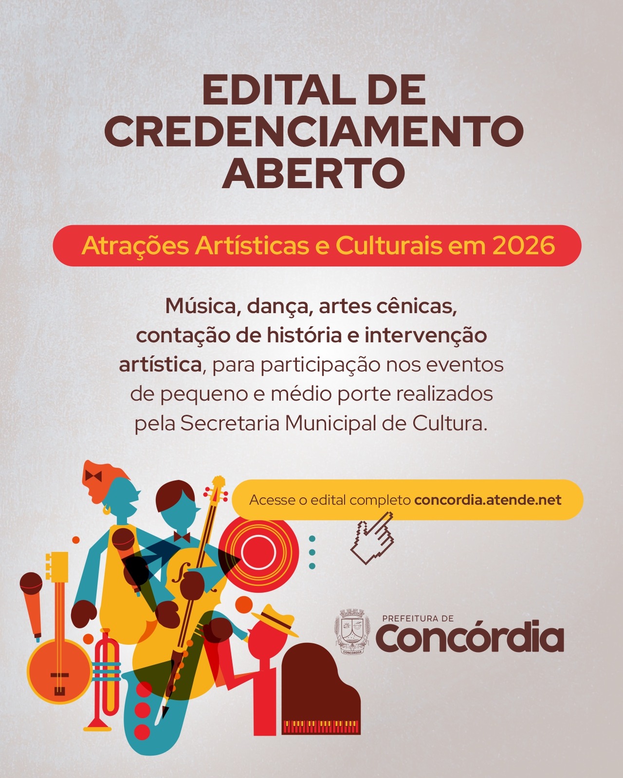 Está publicado o edital que visa a contratação de atrações artísticas e culturais – música, dança, artes cênicas, contação de história e intervenção artística – para participação nos eventos de pequeno e médio porte, realizados pela Secretaria Municipal de Cultura durante o ano de 2026.